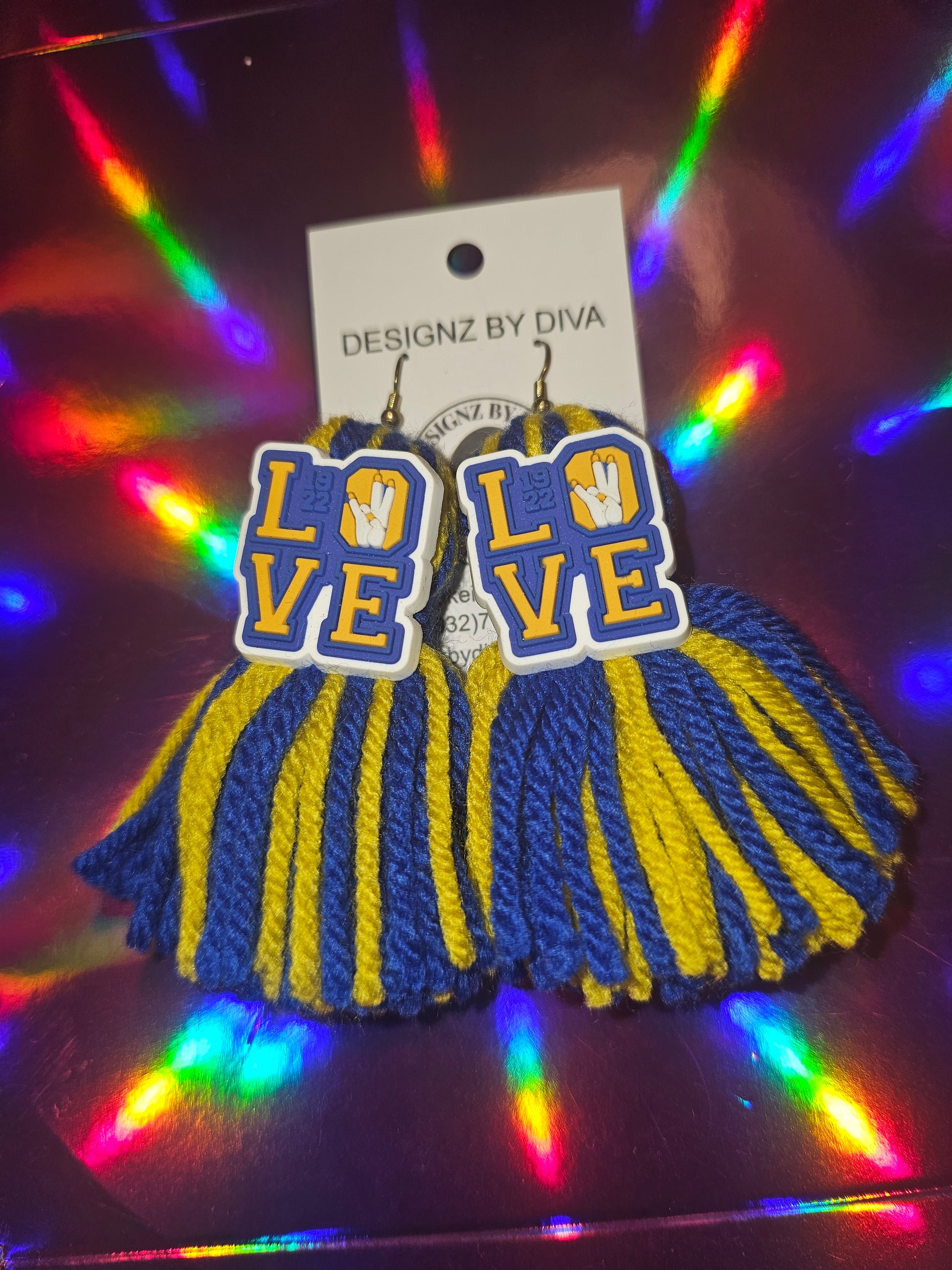 Celebrate sisterhood, pride, and unity with Rhoyal Love. These bold tassel earrings pair Sigma Gamma Rho’s signature royal blue and gold with a striking “LOVE” charm — complete with the founding year and hand sign that speaks to legacy and loyalty.
